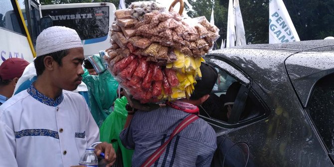 Sontak para peserta aksi mengerubuti mobil tersebut. Pedagang asongan yang lainnya pun tampak mengantre agar dagangannya ikut diborong.